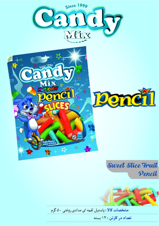 پاستیل کندی میکس – پاستیل مدادی لقمهای روغنی ۵۰ گرم یک میانوعده شیرین و میوهای است.