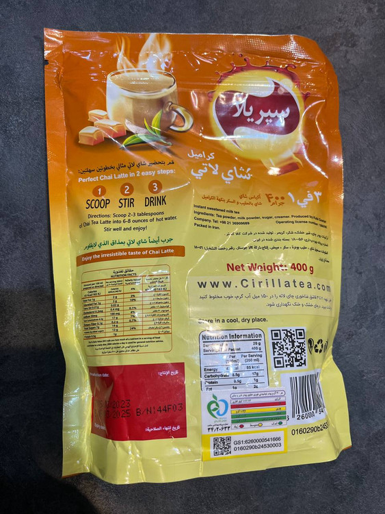 - ترکیب اصلی: چای سیاه، شیر خشک، شکر، طعمدهنده طبیعی کارامل